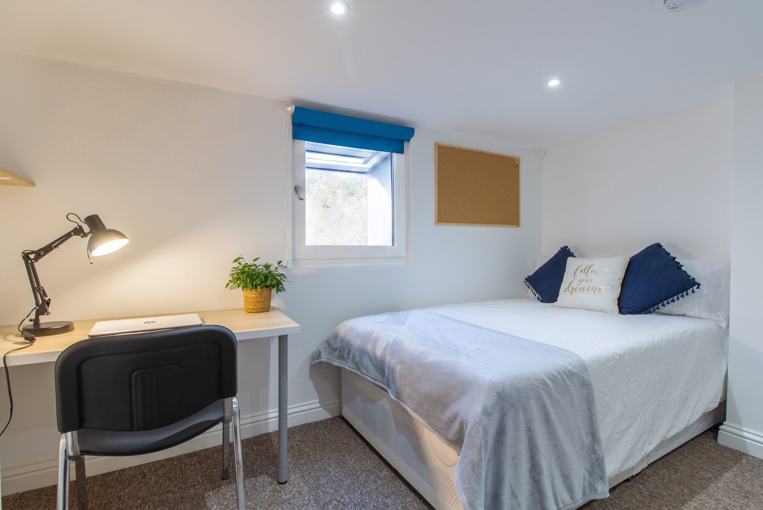 In the basement, this large room includes a double divan bed with two drawers, two movable storage units, a desk with a chair, and a shelf. The carpeted floor with underlay ensures comfort, and the multiple downlights provide ample light.