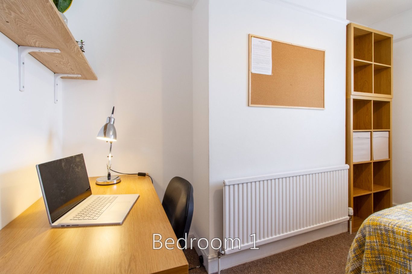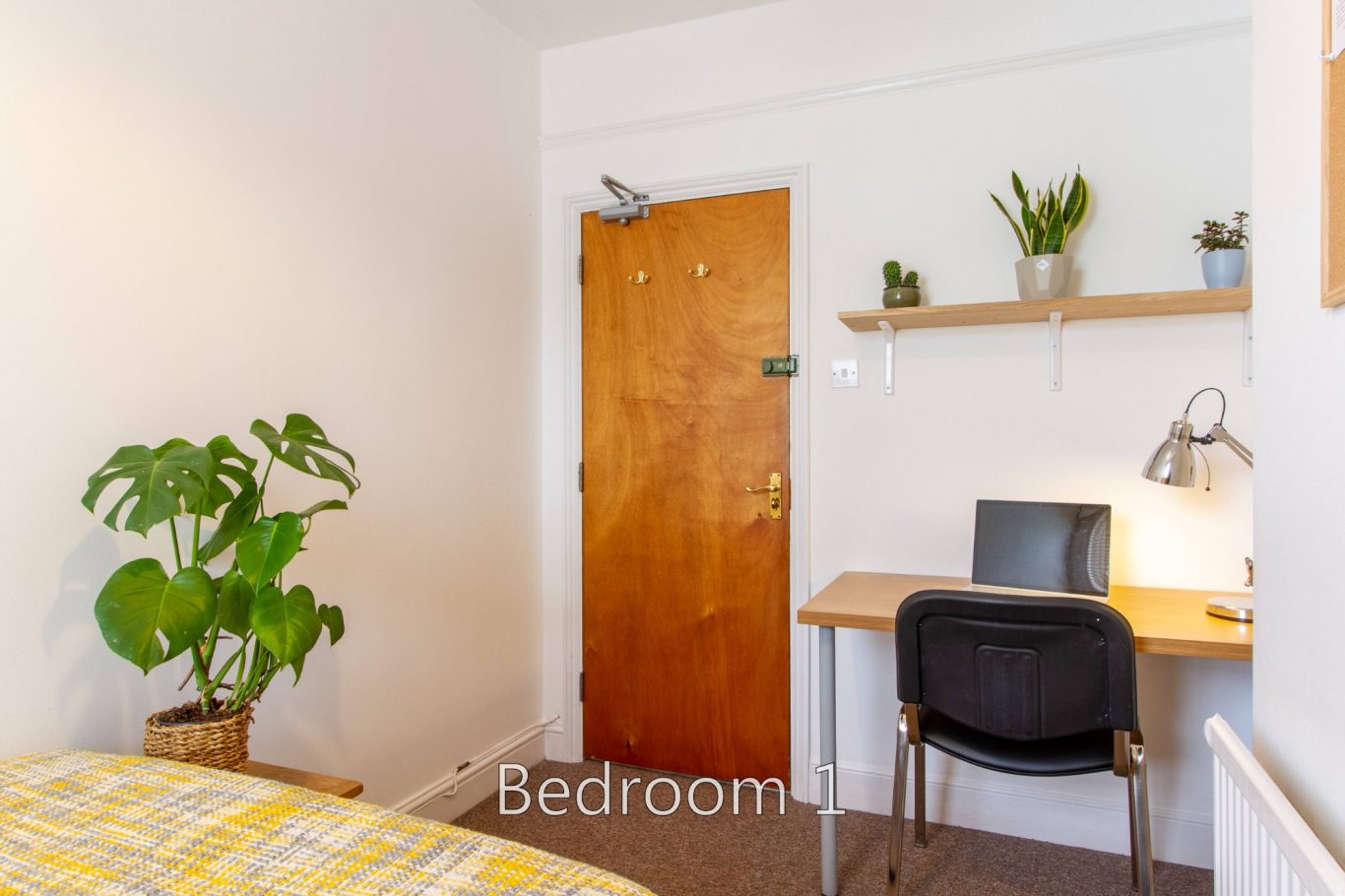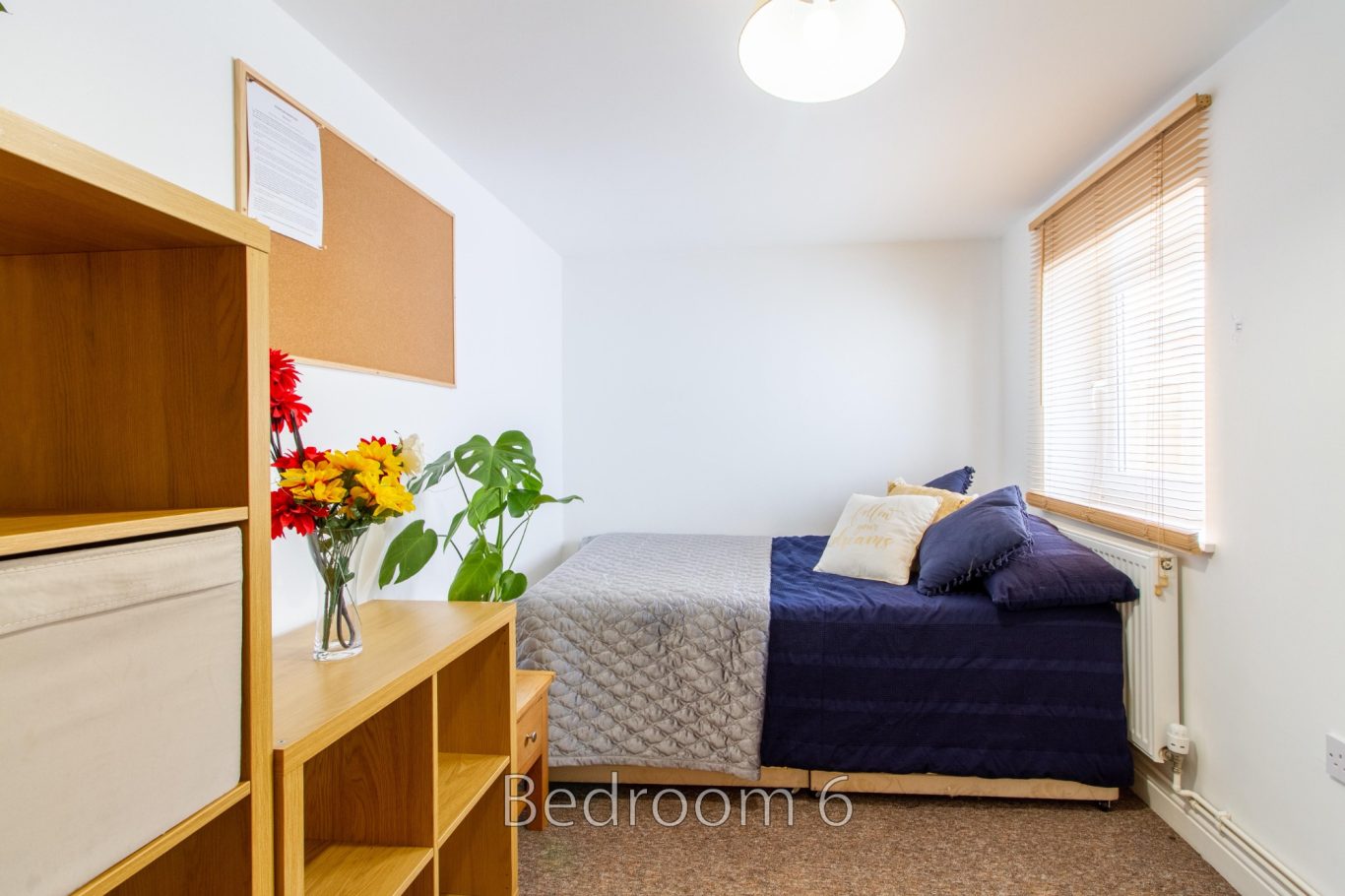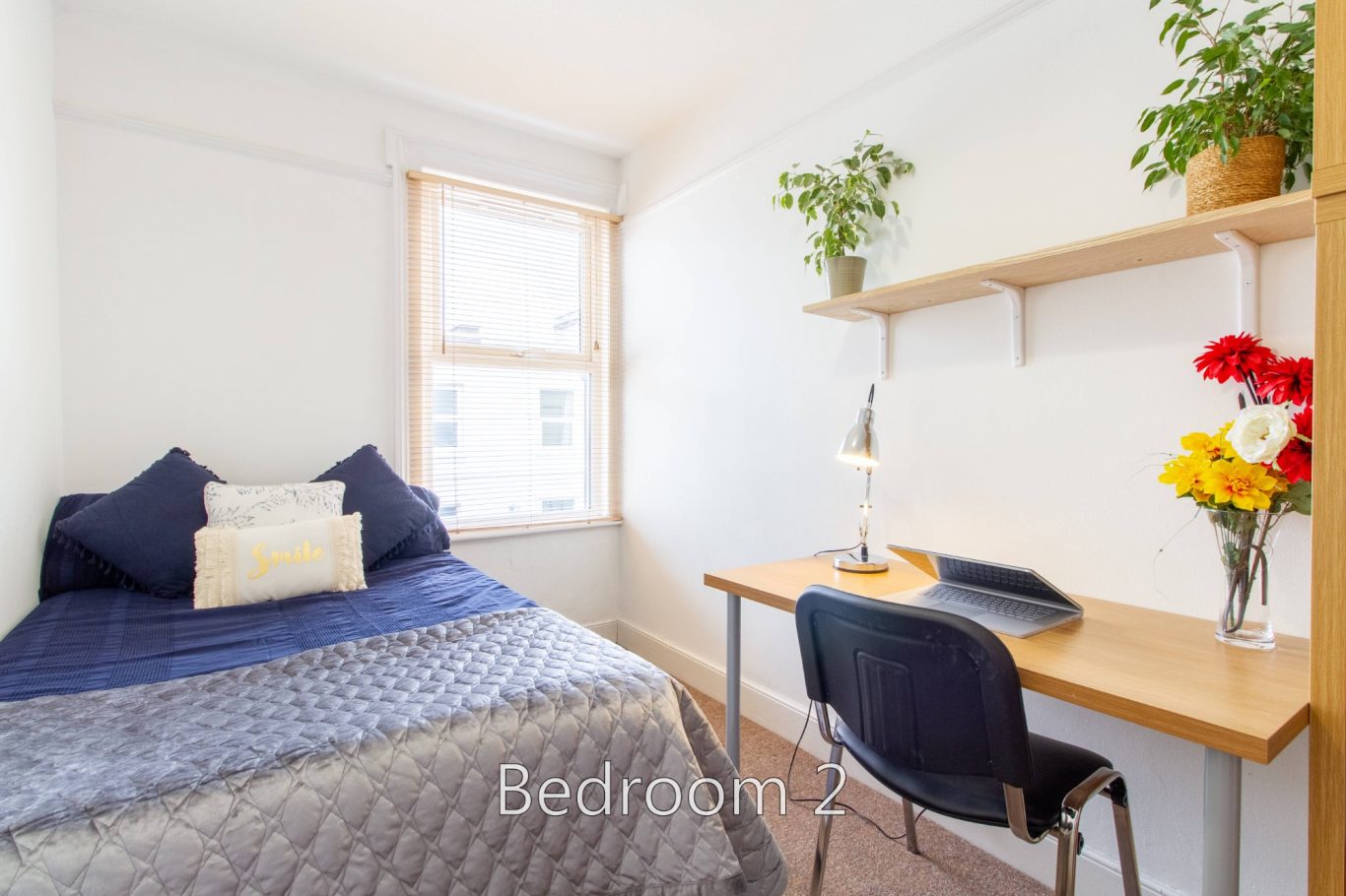 Located on the first floor at the front of the house, this bright room features a double divan bed with storage, a large storage unit, desk, chair, and venetian blinds. The room is fully carpeted and filled with natural light.