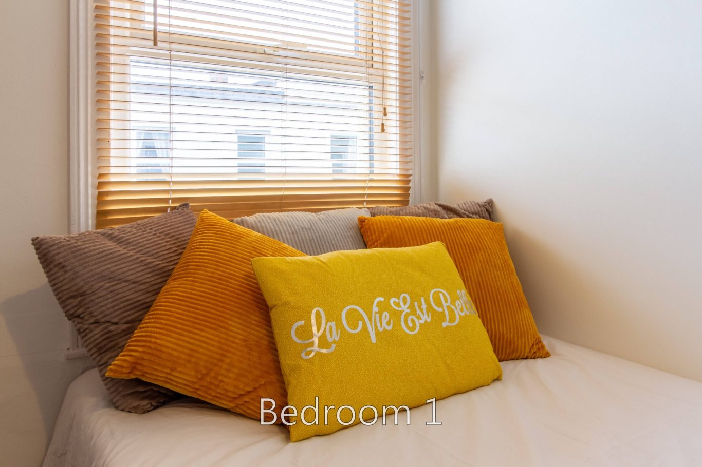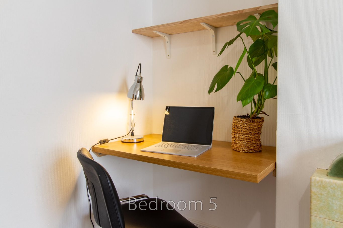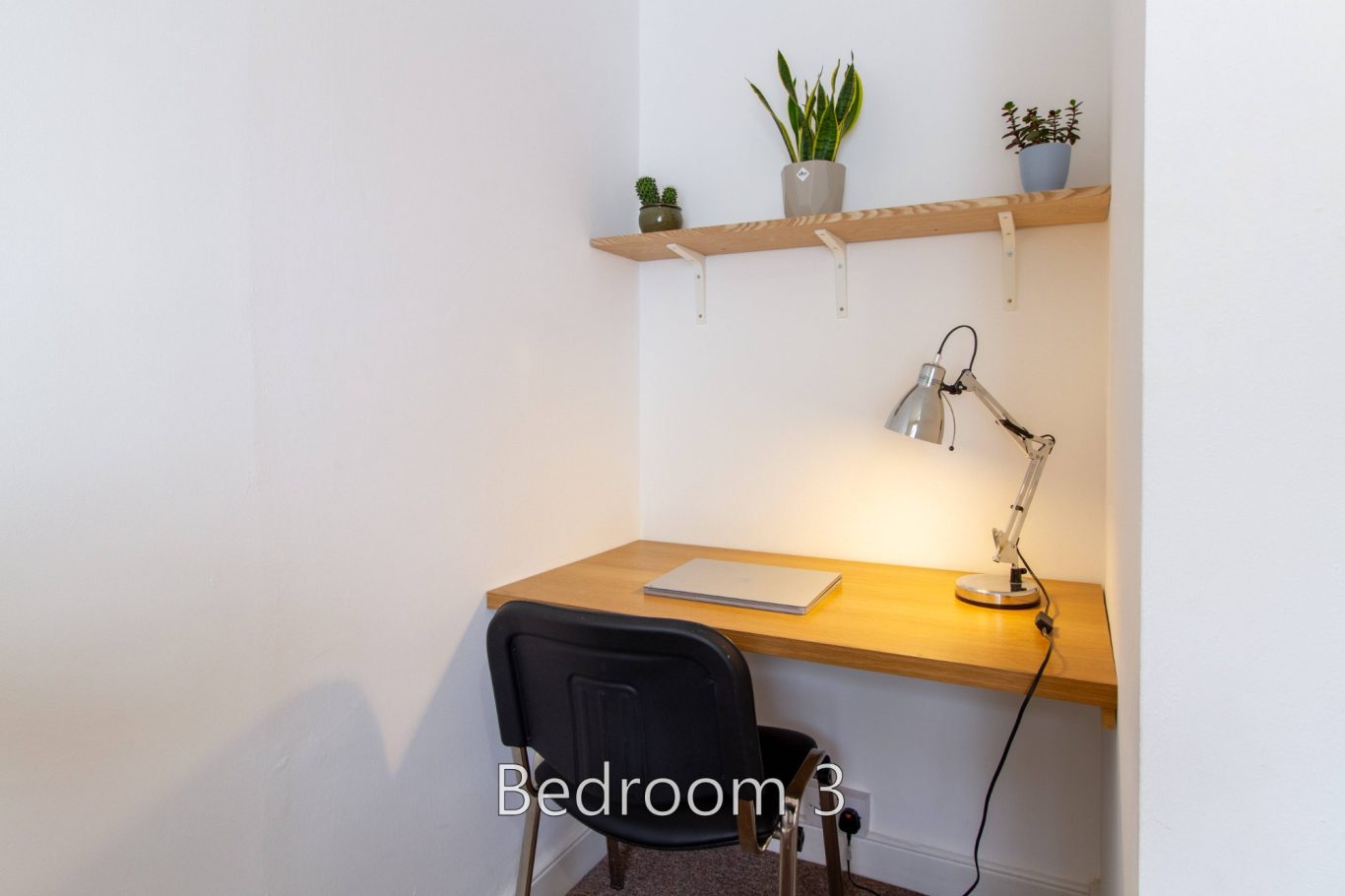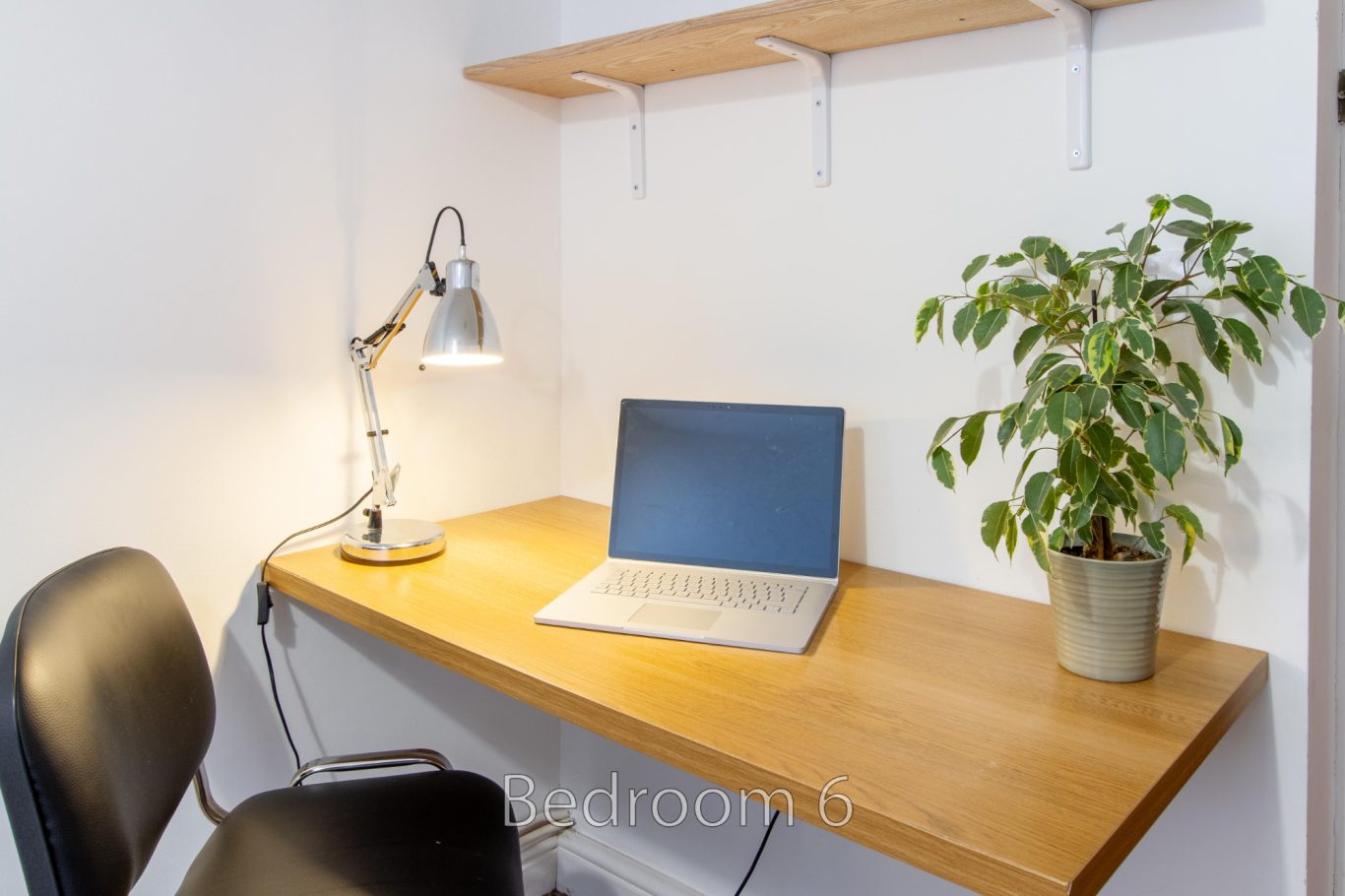 This large ground-floor front room, with a charming chimney breast, offers plenty of character. It includes a double divan bed with storage, a double storage unit, desk, shelf, chair, and venetian blinds, all in a cozy, inviting space.