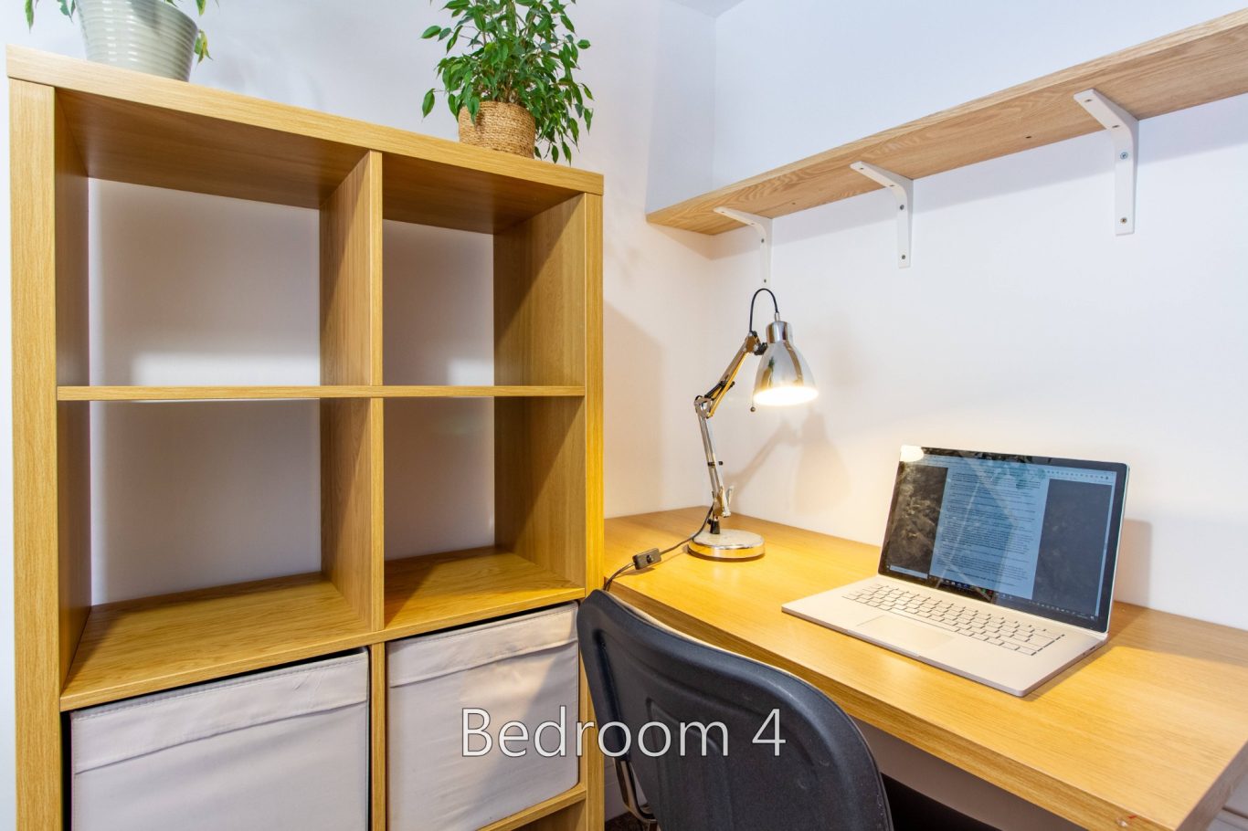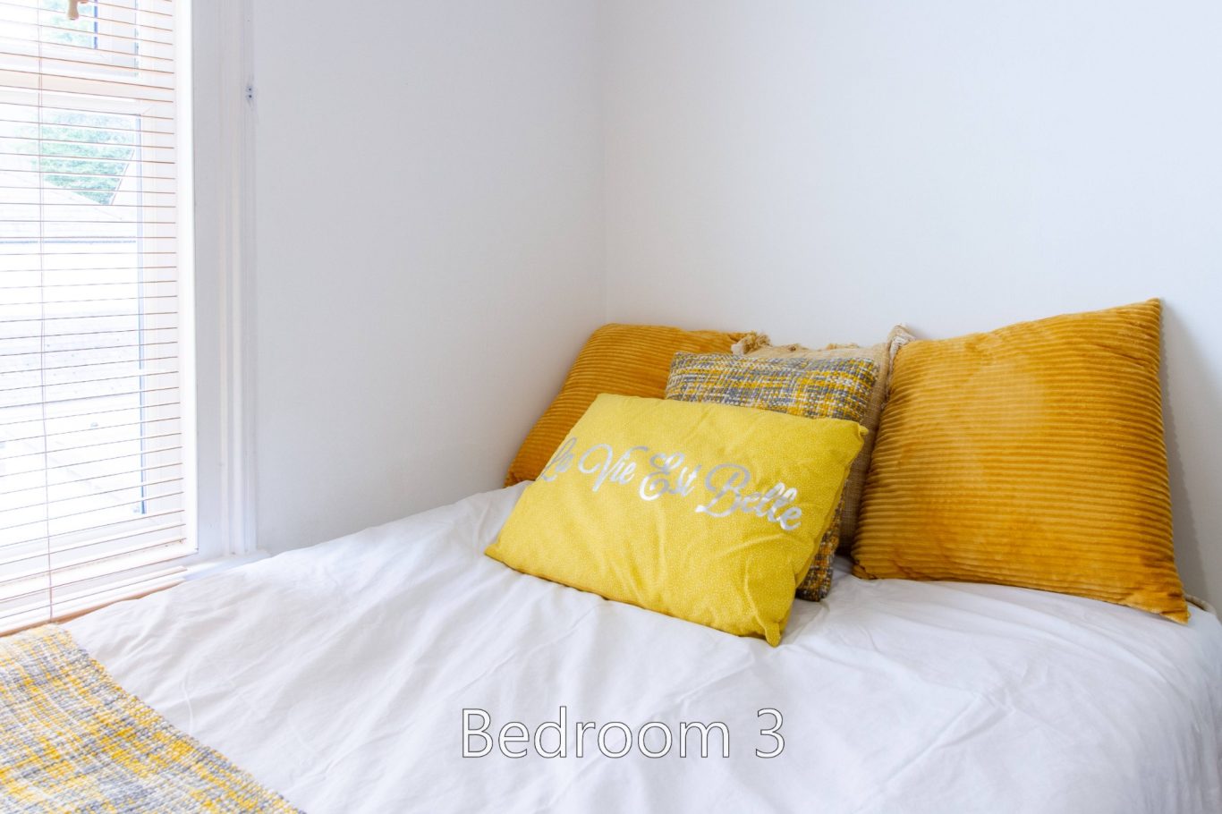 This cozy room on the first floor at the front of the house offers a double divan bed with storage, a double storage unit, desk, chair, and venetian blinds. It’s a quiet, comfortable space with plenty of light.