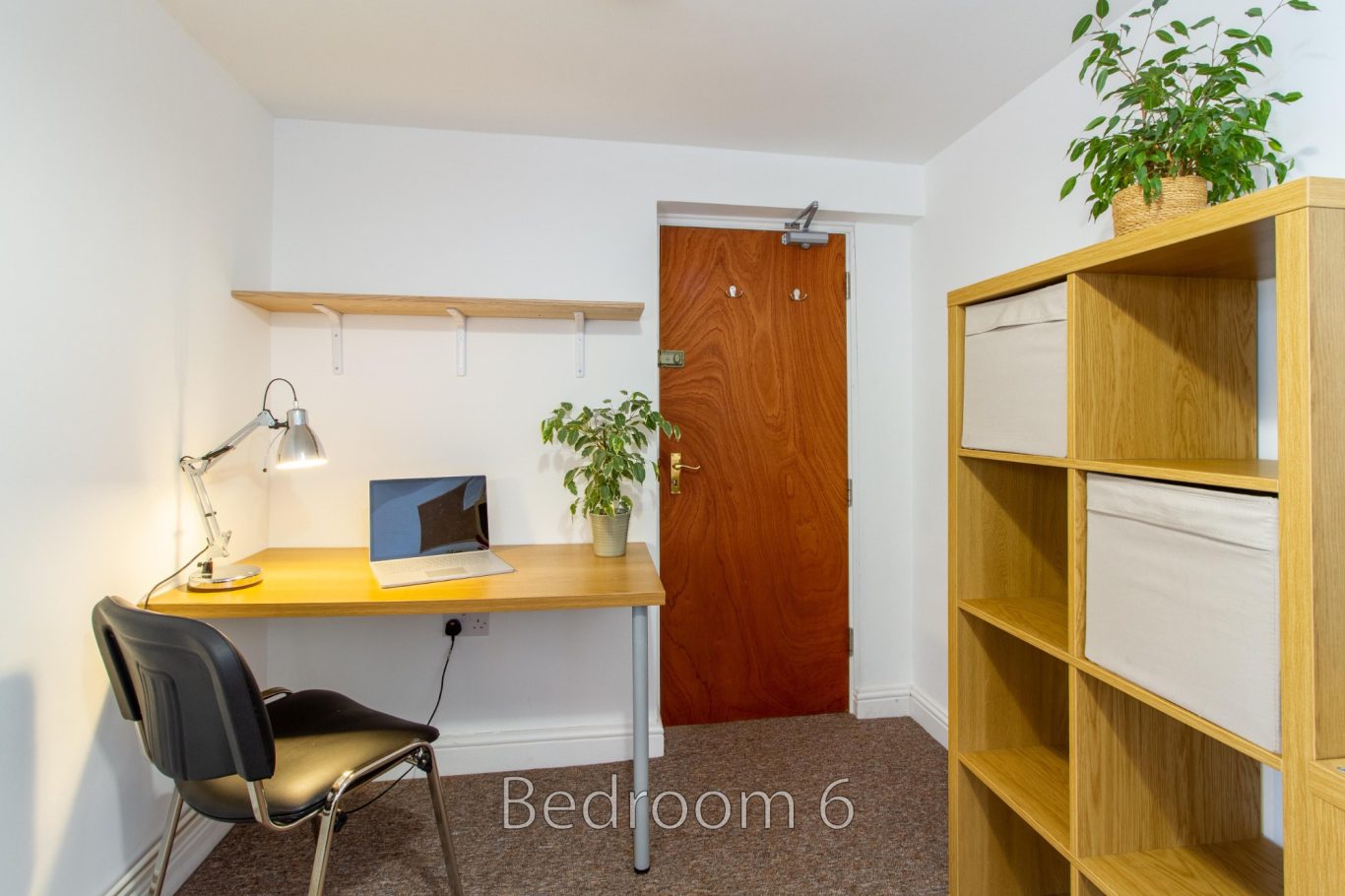 At the rear of the first floor, this compact room features a double divan bed with storage, a large storage unit, desk, shelf, chair, and venetian blinds. It’s bright and functional.